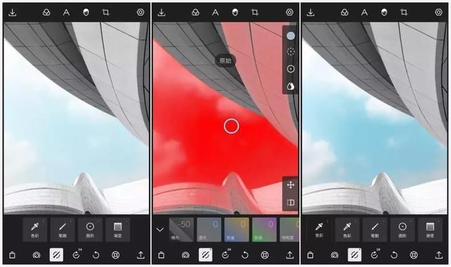 5、接着我们进入局部调整工具,新建一个色彩调整,将中心点放在天空,这样我们的影响区域就集中于天空,图中红色区域就表示受到我们影响的区域,红色越深表示受到的影响越强烈。我们降低这些区域的值,让天空的形态看起来更加明显: