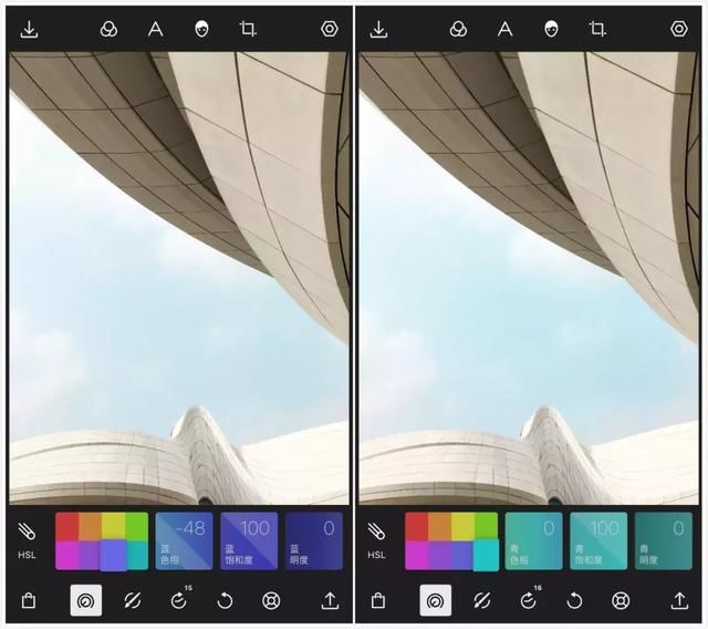 3、接着我们来增强天空的色彩,我们进入全局调整的HSL工具,选中蓝色,降低蓝色的色相,让天空的色彩偏向于绿色一些,同时提高蓝色与青色的饱和度,让天空的色彩更加鲜艳: