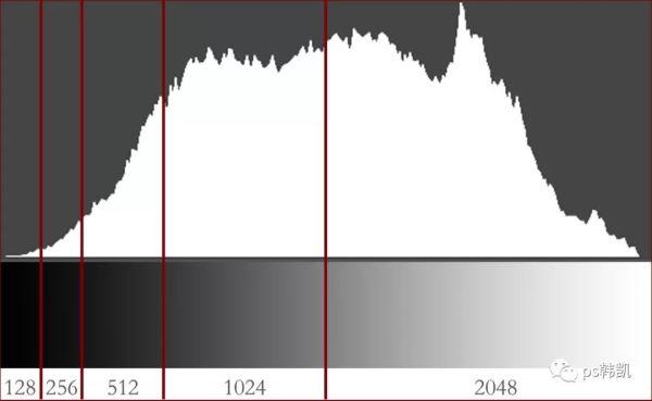 拿12位图像举个例子,12位图像记录的单个通道色彩深度是4096,但是4096并不是平均分布在直方图上,而是从亮部到暗部倍减。