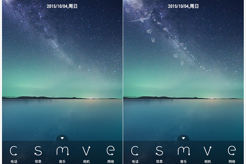 它的锁屏也是十分有趣的。锁屏状态下,屏幕底部有个向上的三角图标,点击一下就会出来很多字母样的手势图标,可以根据字母下面的中文提示在屏幕上划出对应的字母来唤醒相应的软件。滑动解锁时还有一串钻石跟随手指,十分有趣。