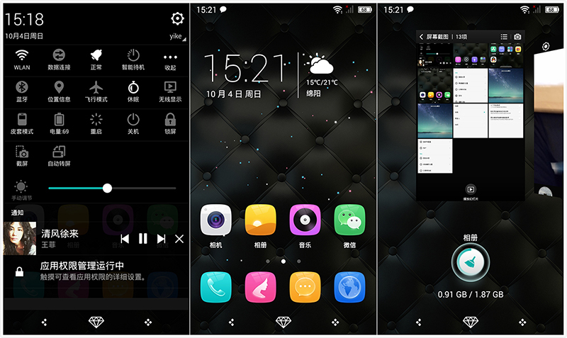 这个法国SUGAR2C手机在桌面添加了一点小心机,滑动界面时,图标还会飞出彩色的小粒子。下拉菜单的快捷功能键齐全丰富,已经开启的图标显示白色,未开启的显示灰色,一目了然。单击右下角的四点图标虚拟按键则开启后台程序,一键清理后台程序的设计方便快捷。老妈表示很喜欢这个彩色小粒子在屏幕上飞来飞去。
