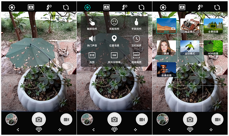 UGAR2C手机的系统默认相机界面简单,功能图标一看就能明白。相机界面上端的A字图标是拍摄模式按键,单击打开后发现里面有几种常用拍摄模式,适合日常使用。相机界面右上角的反转图标,单击一下这个图标就自动切换至前置摄像头,这样就可以进行自拍了。界面与后置摄像头拍摄界面一致,不过界面上段的A字图标变成了一个长发美女的图标,单击打开则显示出三中自拍模式,其中全景自拍模式让老妈眼前一亮,把玩了一番发现与全景拍摄的方式一样,不过换到了自拍模式上,这也是一个创新,适合聚会时人多自拍手机却装不下那么多人。
