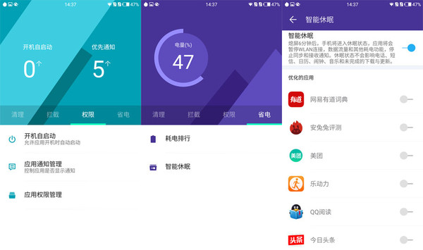 在管理中心当中,除了常规的清洁功能之外,还有自启动管理,可以减少不必要的应用占用CPU与RAM资源,降低耗电量与发热量。智能休眠的实用性也是比较高的,在用户闲置手机的时候,选择优化的应用会断开网络连接,停止同步和接收通知,熄屏6分钟后手机便进入休眠状态,有效提高续航时间。