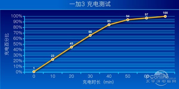 从测试的数据上看,一加3从0%电量到充满100%一共消耗了69分钟的时长,对于电量为3000mAh的一加3而言这个成绩相当不错。一加30分钟可将电量充到63%(玩游戏、上网、看电影等情况),从PConline测试出来的数据上看,30分钟一共充进了66%的电量(熄屏、关闭WiFi等所有模块),比较吻合的说法。