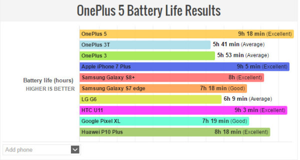 Phone Arena编写了一个脚本文件,用于模拟手机的日常使用,所有参与测试的手机屏幕亮度均设为200nit,这一亮度完全满足室内使用。如图所示,一加5的续航时间达到了9小时18分钟,超过了三星S8, iPhone 7 Plus以及Plus等主流旗舰手机。