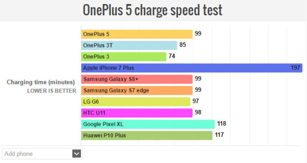 而在充电测试中,一加5在Dash Charge快充的下也有较为不错的表现,耗时99分钟即充满电,与参与测试的大多数旗舰机充电速率差不多,至少是超过了平均水平,但是意外的是,一加5竟然比一加3和3T要慢。