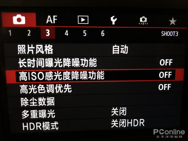 在一些光线较暗的下,为了能获取正常的或者较快的快门,就不得不把ISO感光度提高,但是对于高感不强的数码相机来说,提高ISO感光度,画面就会出现很多噪点,为了画面的美观和清晰度,需要对画面进行降噪处理。打开佳能相机的设置,高ISO感光度降噪选项就在第三页,根据需求不同,有相应的降噪级别,分别有关闭、弱、标准、强、多张拍摄降噪: