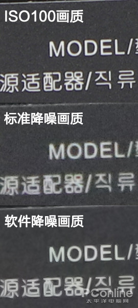 为了能充分体现数据的真实性,我关闭了佳能EOS 5D4的所有辅助校正功能,包括镜头校正数据、自动亮度优化和长时间降噪。用Av档拍摄一张ISO100的作为参考,然后提高至ISO12800分别拍一张关闭降噪、标准降噪和多张拍摄降噪的照片,在Photoshop中用Dfine 2降噪软件对关闭了降噪功能的ISO12800感光度图片进行降噪处理,截取充电器上的文字细节,测试结果如下表:
