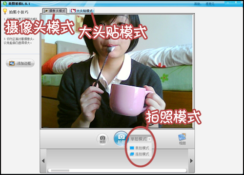 如果你也有相同的烦恼,那我推荐你用一款很不错的摄像头大头贴软件美图拍拍(本站高速下载)有了它,就可以将电脑摄像头变成非常方便的多功能自拍机啦。你不仅可以拍出像李柔美那样的连拍效果,还能添加各式大头贴边框。遇到效果不满意的照片,还可以点击按钮“用美图秀秀处理”来美化照片。哈哈,看看她的操作界面吧: