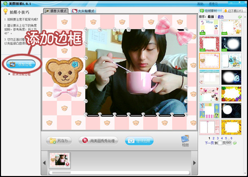 先看看我的最爱添加边框功能,只要随意添加边框就可以变身美丽大头贴,再也不用跟人挤机器排队了,也不必担心在众人面前摆POSE的尴尬,太方便啦!只要单击“添加边框”,然后在右侧选择喜欢的大头贴边框就行喽。