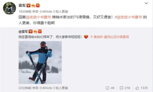 不过这条拜年微博可并没有那么简单,在祝贺之后雷军又打起了自家产品的广告,在这条微博的转发评论区说道“推销米家出的TS滑雪镜,又好又便宜”。米家的智能家具已经得到了网友们的认可,虽然不少人仍认为这些家居产品创意抄袭,做工也不及原装精致,但是凭借着低廉的售价在中国也有了相当大的占有率和市场。这次的滑雪镜也不例外,只要399就可以拥有它,相信不少滑雪爱好者看到这里也心动了吧。